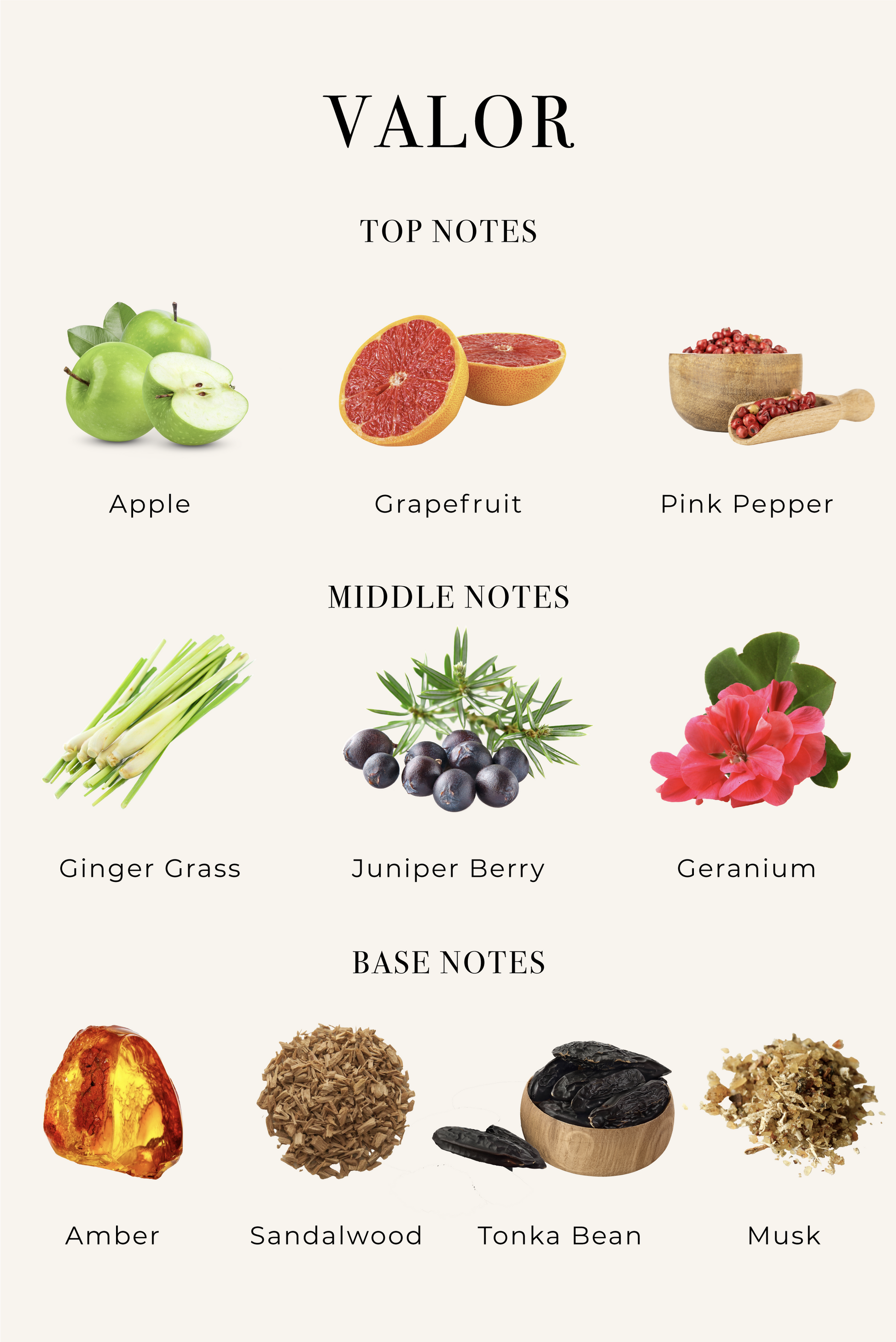 Bergamot Oil, Lemon Oil, Elemi Oil, Egyptian Geranium Oil, Juniper Berry Oil, Clary Sage Oil, May Chang Oil, Olibanol Oil, Pink Pepper Oil, Haitian Vetiver Oil, Ginger Oil, Cedarwood Atlas Oil, Gingergrass Oil, Tonka Bean Absolute